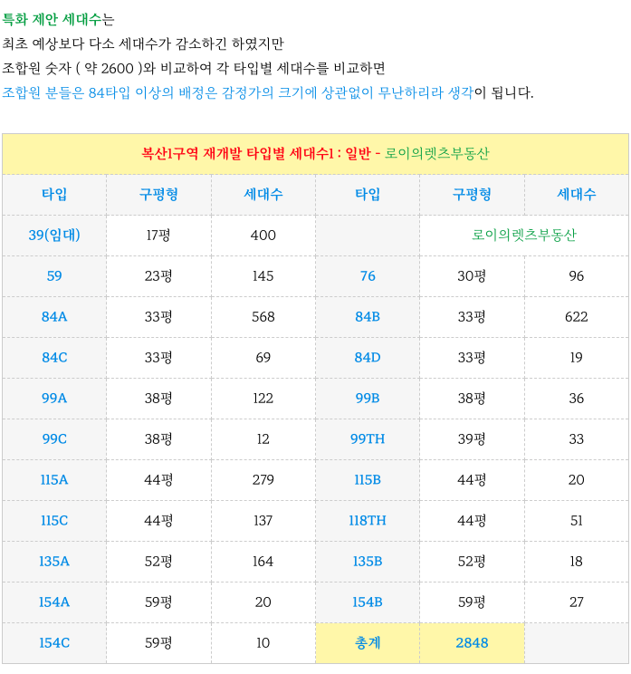 동래구 복산1구역 재개발 GS건설의 특화 제안에 따른 각 타입별 세대수입니다.