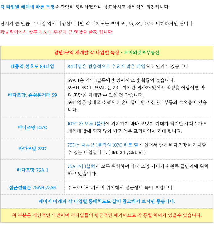 감만1구역 재개발의 각 타입별 주요 특징 입니다.