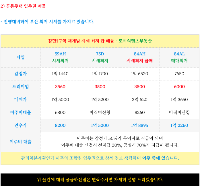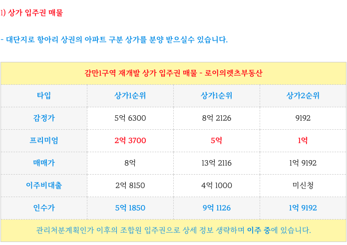 감만1구역 재개발 상가 입주권 및 공동주택 입주권 타입별 최저 물건들을 소개해 드리겠습니다.