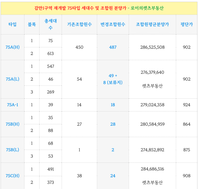감만1구역 재개발의 각 타입별 세대수 및 조합원 분양가 입니다.