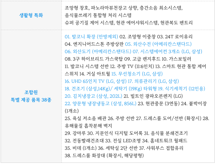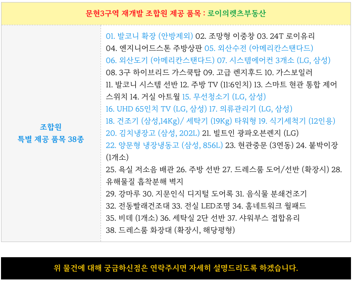 - 조합원 분들에게 지급되는 특별 품목 역시도 고급 내장제와 우수 가전제품 으로 큰 혜택이 됩니다.