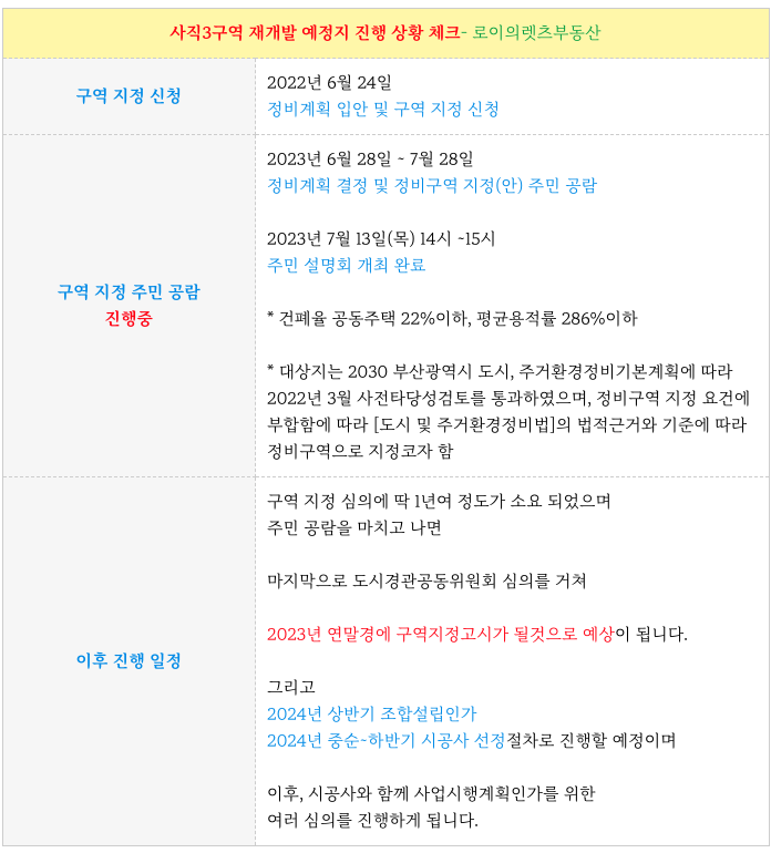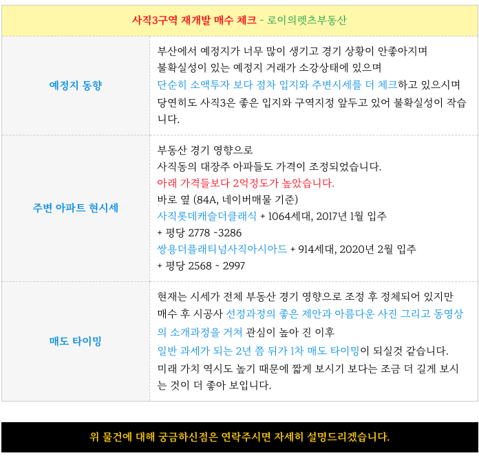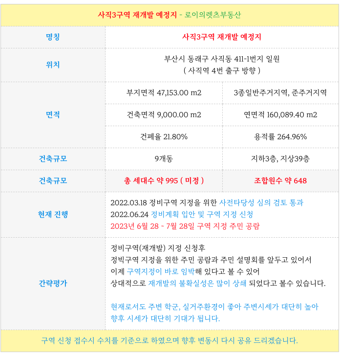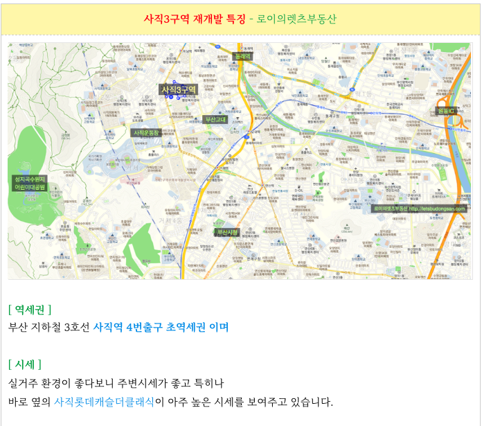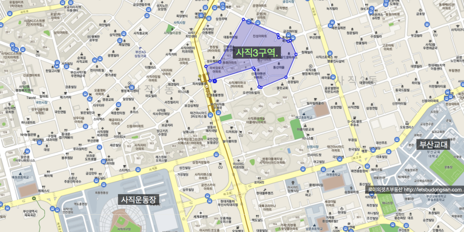 안녕하세요. 로이의렛츠부동산 ( 제이에이케이 부산 부동산중개법인 ) 입니다. 사직3구역 재개발 [ 초역세...