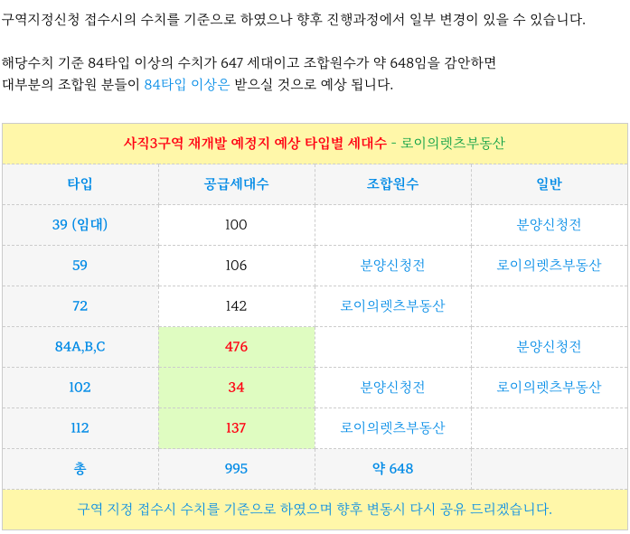 사직3구역 재개발 예정지의 예상 타입별 세대수 입니다.