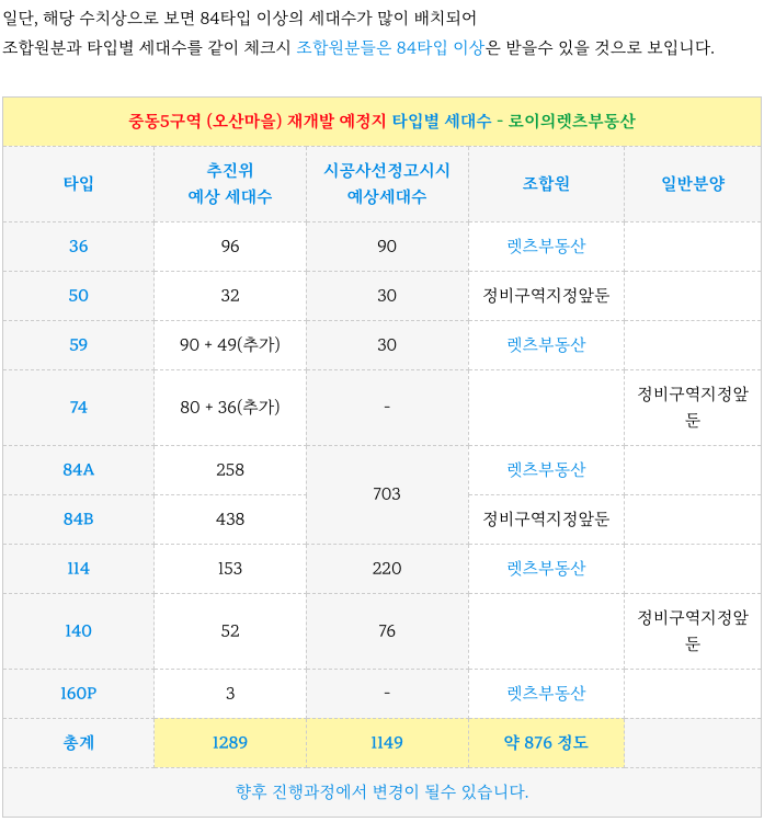 중동5구역 (오산마을) 재개발 의 예상 타입별 세대수 입니다.