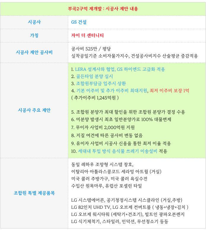 부곡2구역 재개발의 시공사 제안 내용 입니다.