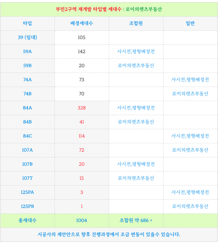 부민2구역 재개발 현 타입별 세대수 입니다.