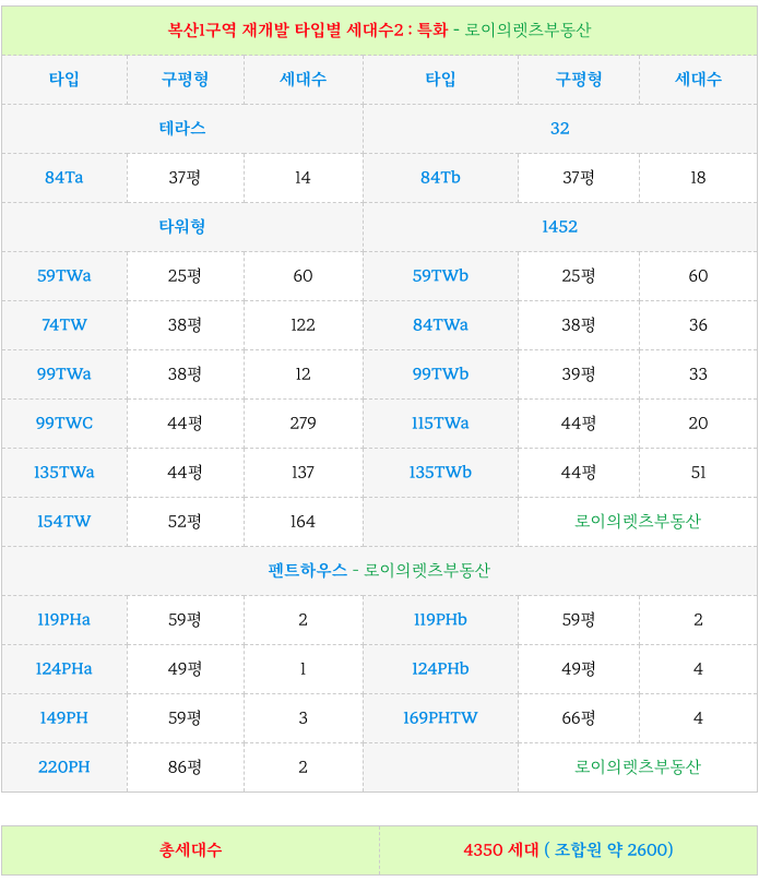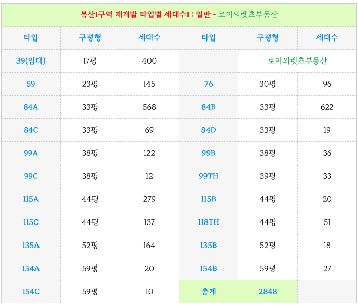 동래구 복산1구역 재개발 GS건설의 특화 제안에 따른 각 타입별 세대수입니다.