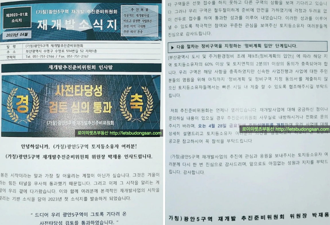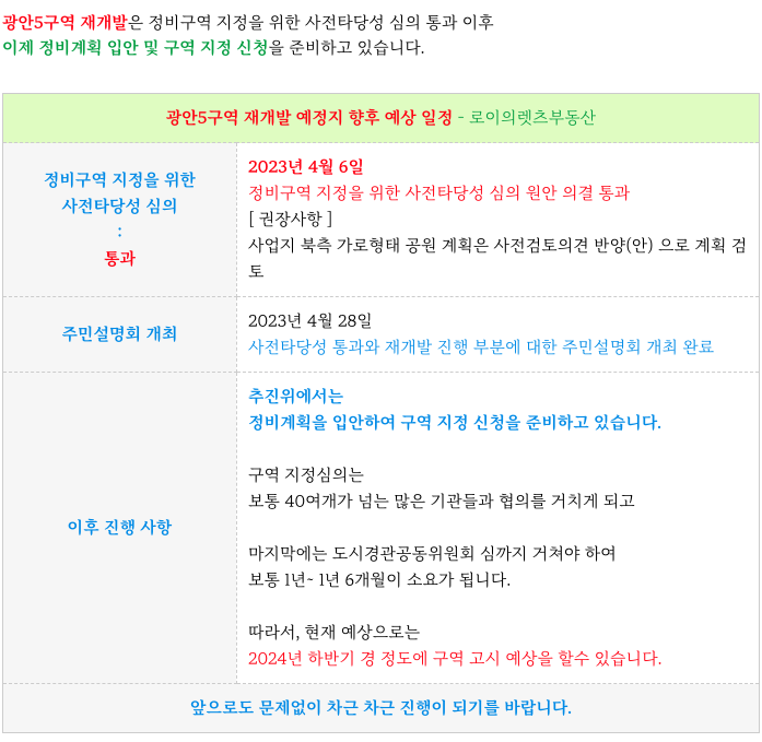광안5구역 재개발의 현재까지의 진행상황 정리등 추가 정보는 아래 페이지를 참고 부탁드립니다.
