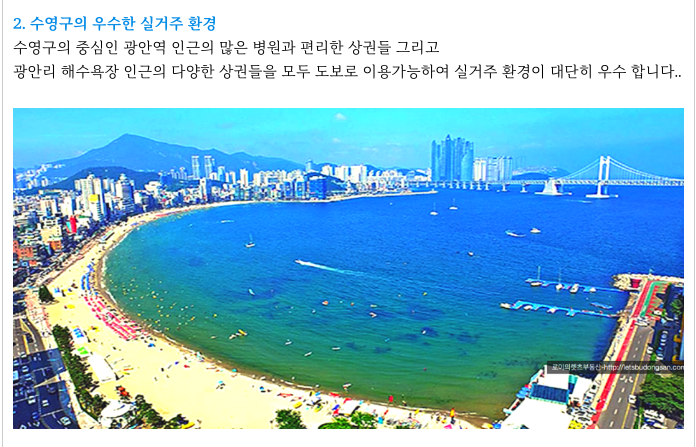 - 수영구 중심 광안동, 광안리 해수욕장, 주변시세 높은