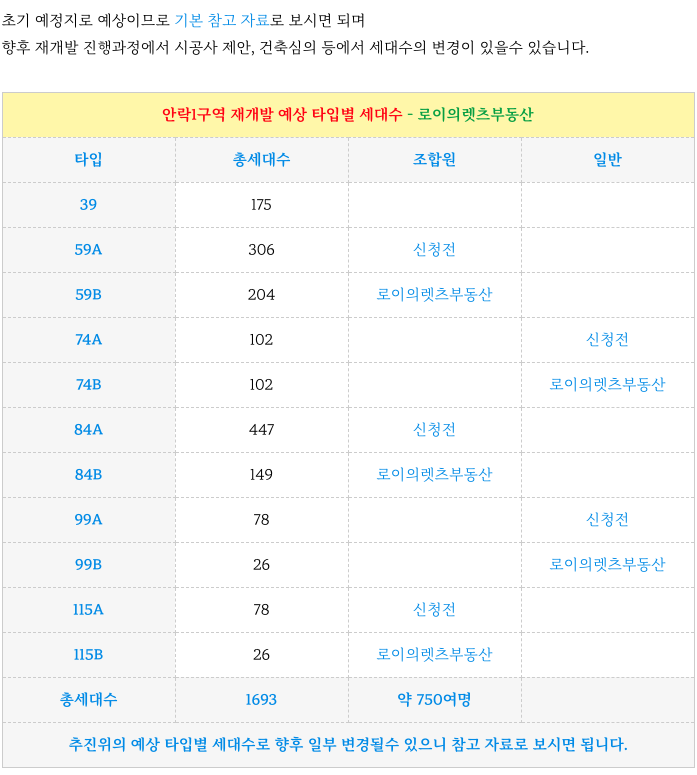 안락1구역 재개발 예정지의 예상 타입별 세대수 입니다.