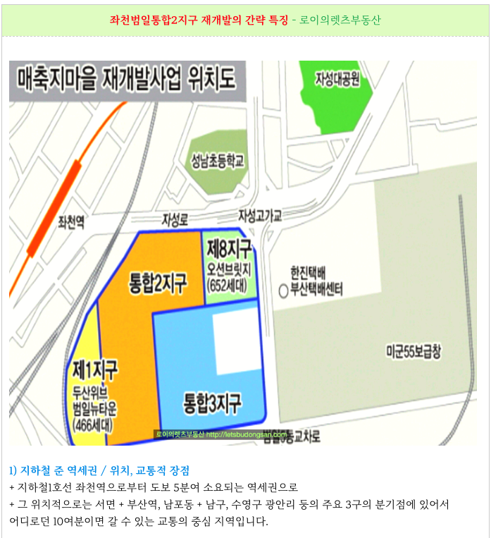 좌천범일통합2지구 재개발의 주요 특징들입니다.