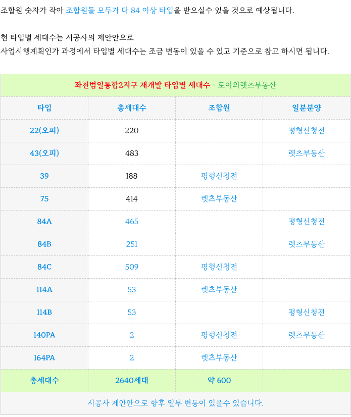 좌천범일통합2지구 재개발의 현재의 타입별 세대수 입니다.