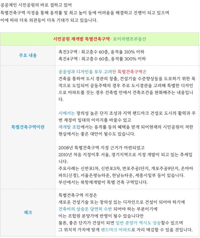 시민공원 촉진3구역 재개발의 간략한 특징 을 다시 한번 정리 드립니다.