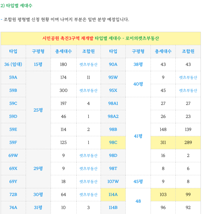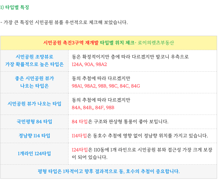 시민공원 촉진3구역 재개발 의 주요 타입별 특징 및 세대수 정리 소개해 드립니다..