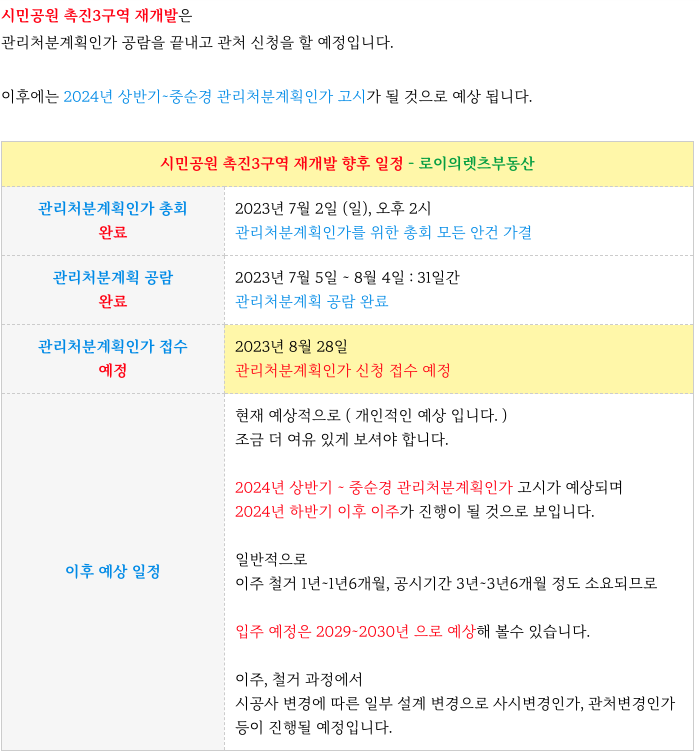 시민공원 촉진3구역 재개발 진행과정과 향후 일정등을 정리등 추가 정보는 아래 페이지를 참고 부탁드립니다.