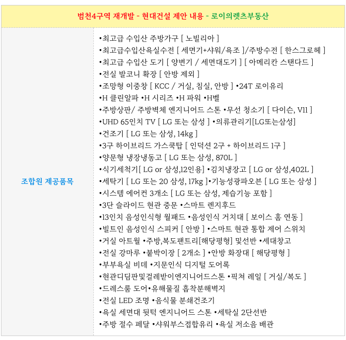 범천4구역 재개발의 시공사 현대건설이 제안한 조합원 제공 품목 입니다.