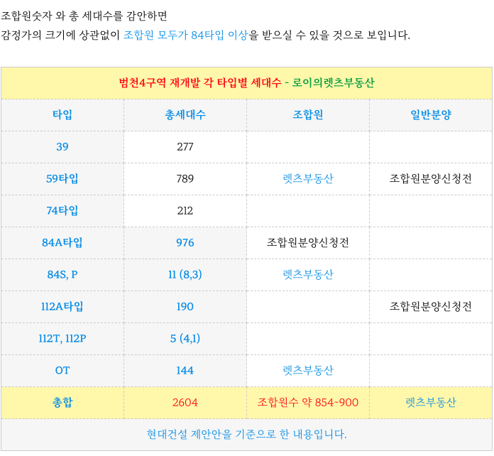범천4구역 재개발 의 각 타입별 세대수 입니다.