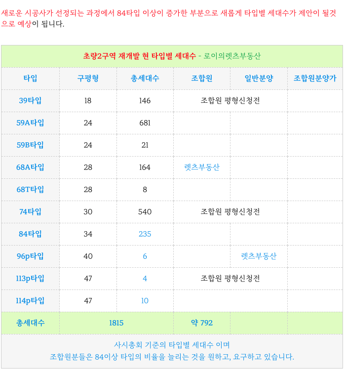 조합원분들의 다수가 84타입 이상의 세대수를 더 늘리는 것을 원하고 있습니다.