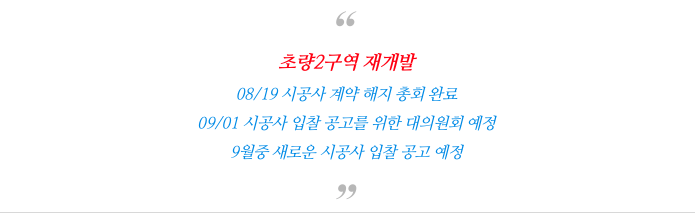 초량2구역 재개발 은 기 시공사인 호반건설과 계약 해지 총회를 완료하였습니다.