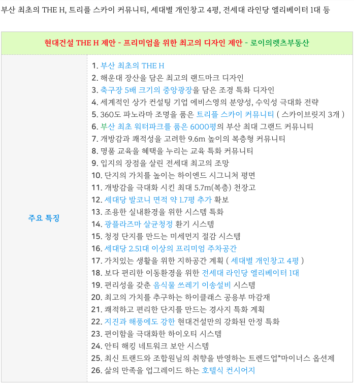 부산 최초의 현대건설의 프리미엄 브랜드 THE H 로 선정되어 부산 최고급, 하이엔드 아파트가 될것은