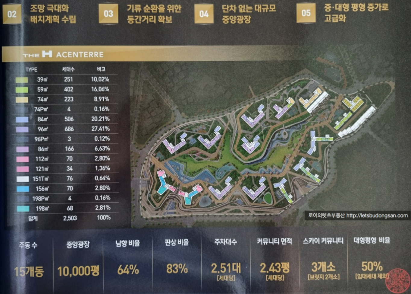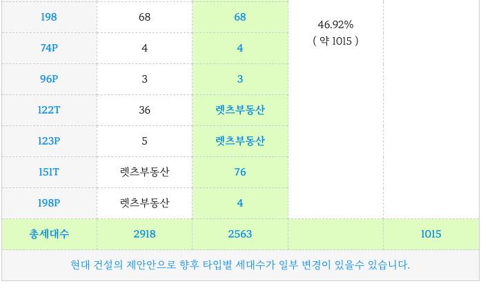 96타입이상이 1015세대로 46.92%가 넘어 고급 프리미엄 아파트를 지향하고 있습니다.