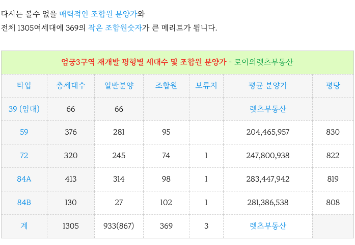엄궁3구역 재개발의 각 타입별 세대수 와 조합원 분양가 소개해 드립니다.