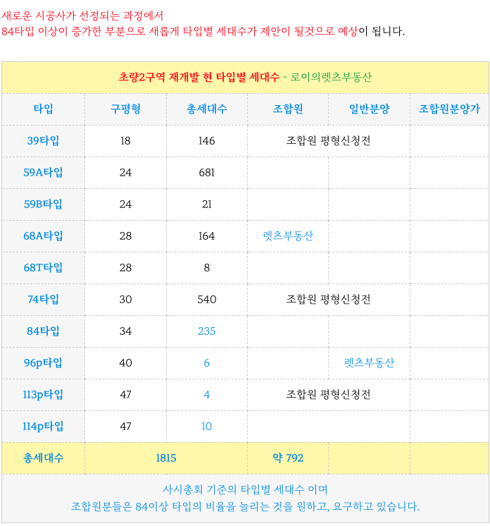 조합원분들의 다수가 84타입 이상의 세대수를 더 늘리는 것을 원하고 있습니다.