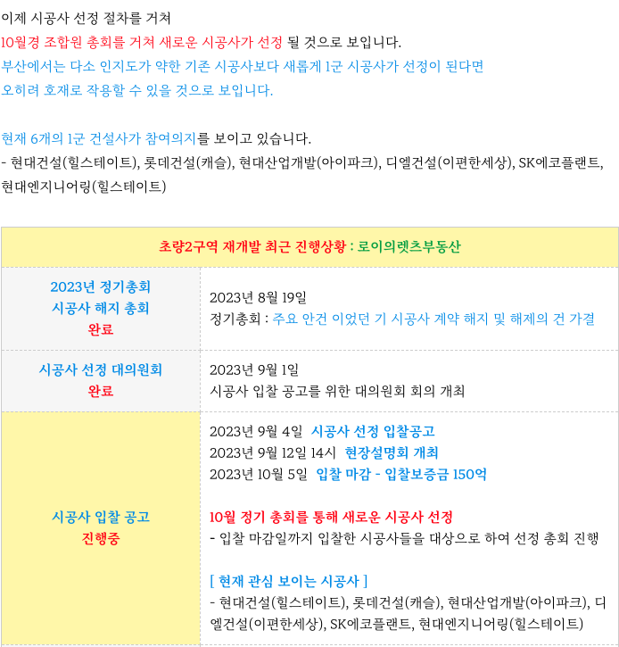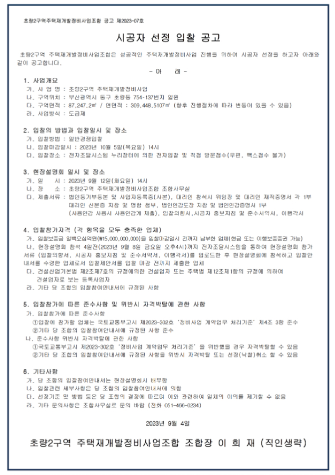초량2구역 재개발 은 새로운 시공사 선정을 위한 시공자 선정 입찰 공고가 있었습니다