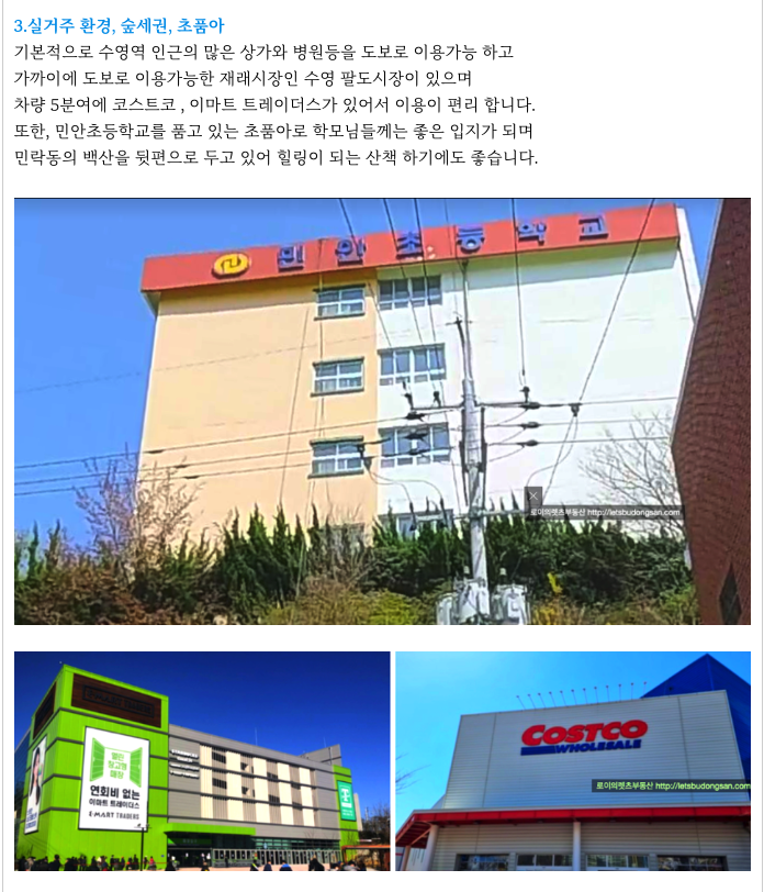 - 팔도시장, 수영역의 많은 상가, 병원, 인근 트레이더스, 코스트코, 신세계백화점