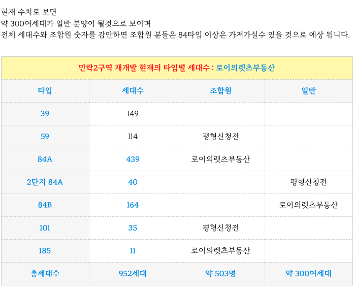 민락2구역 재개발 현 타입별 세대수 소개하여 드립니다.