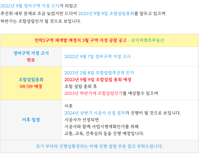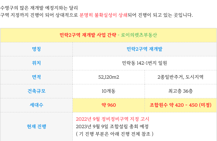 민락2구역 재개발의 지금까지의 진행 상황 정리등 추가 정보는 아래 페이지를 참고 부탁드립니다.