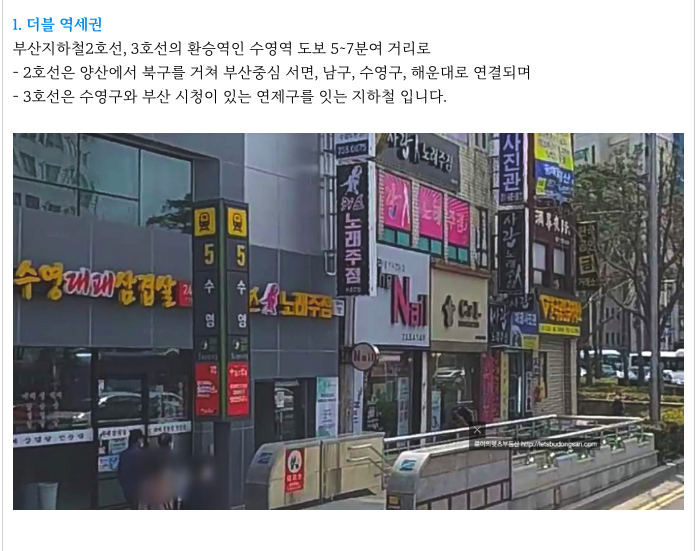 부산 핵심지하철 2호선, 3호선 환승센터인 수영역 도보 5~7분여 거리에 위치한 역세권 이고