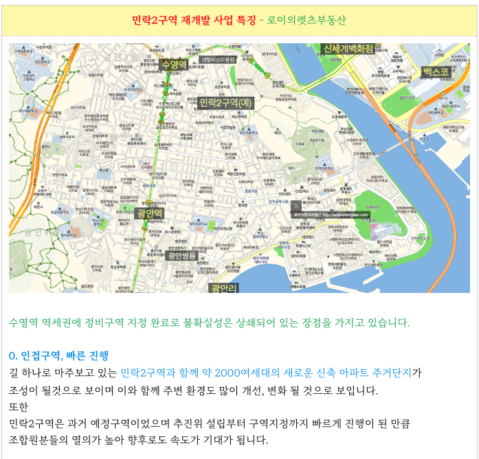 민락2구역 재개발 간락히 특징을 다시 정리하였습니다.