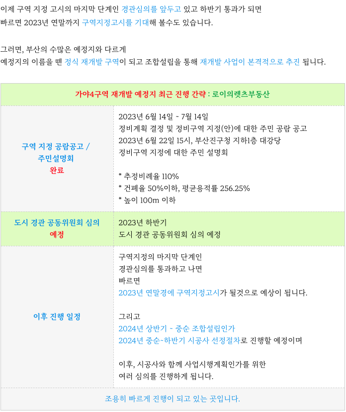 가야4구역 재개발 예정지 기 진행상황 과 향후 예상일정 등 추가 적인 정보는 아래 페이지를 참고 부탁드립니다.