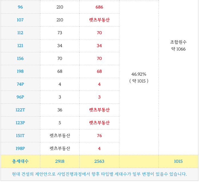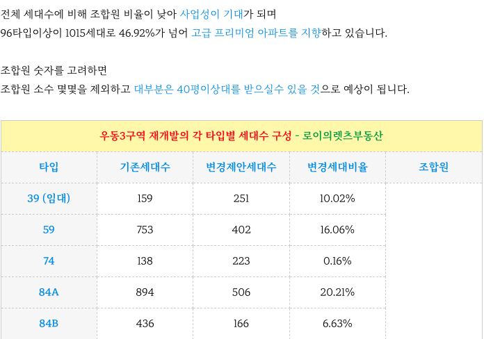 우동3구역 재개발의 타입별 세대수 입니다.