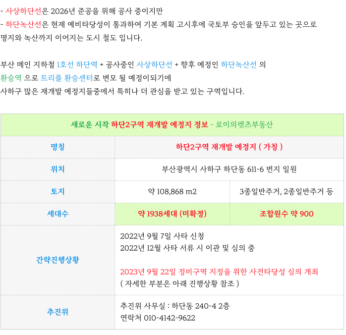 개발호재 많은 하단2구역 재개발 진행 일정과 소액 물건 (토지, 다세대, 아파트등) 정보 소개 드립니다.