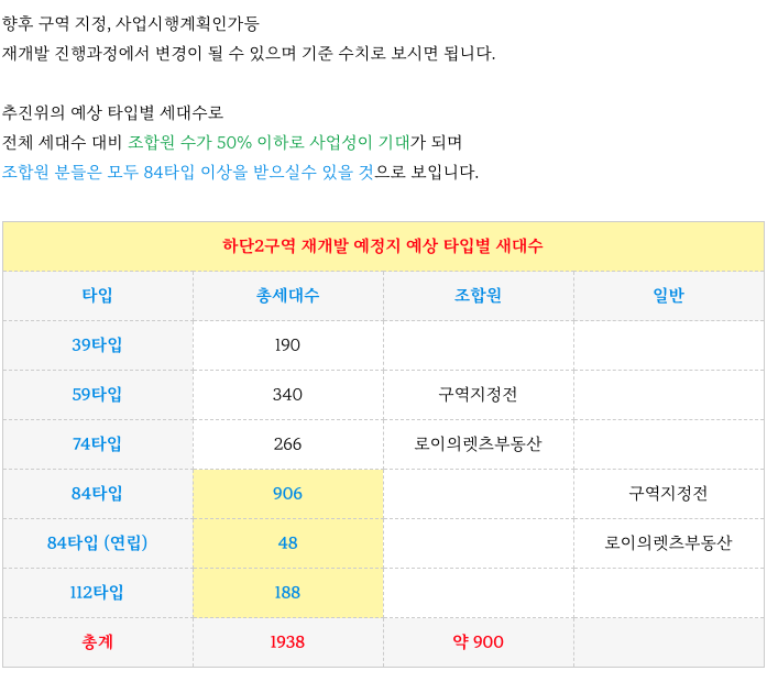 하단2구역 재개발 현 추진위의 예상 타입별 세대수 입니다.