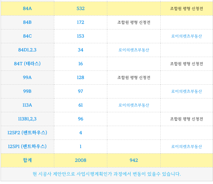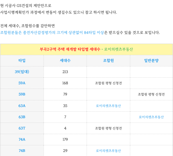 부곡2구역 재개발의 시공사 제안안의 타입별 세대수 입니다.