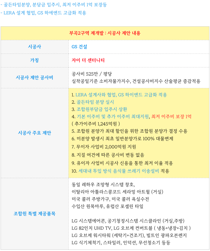 부곡2구역 재개발의 시공사 제안 ( 자이 더 센터니티 ) 내용 입니다.