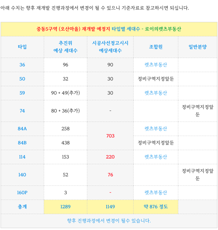 중동5구역 (오산마을) 재개발 의 예상 타입별 세대수 입니다.