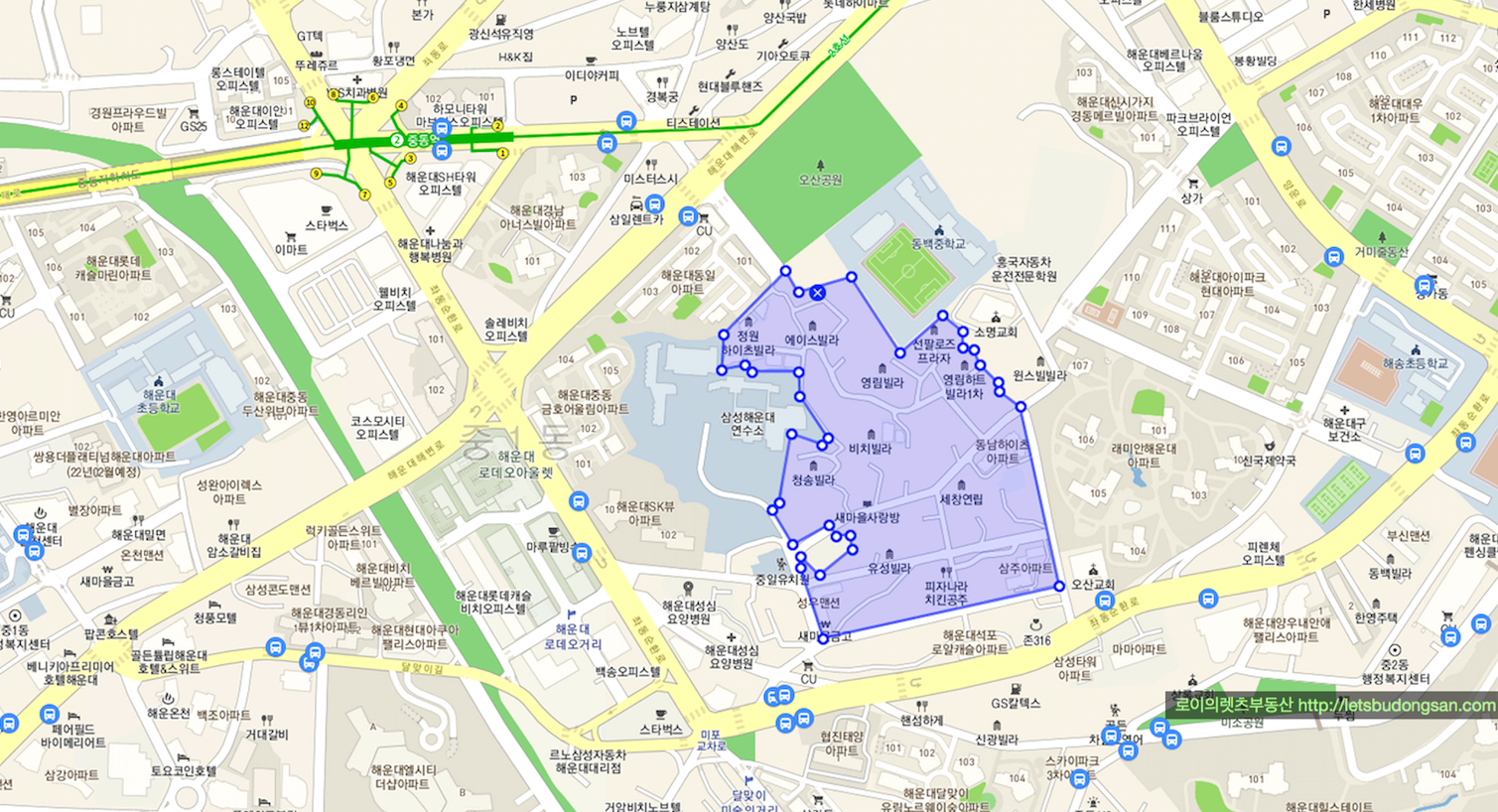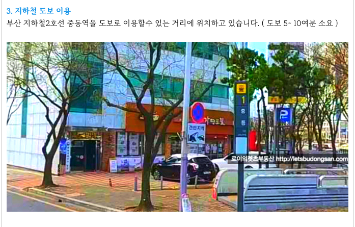 부산 지하철 2호선 중동역에서 도보 5분~10여분 거리에 위치하고 있는 준 역세권 이며