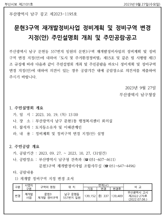 문현3구역 재개발은 정비계획변경에 따른 공람과 주민 설명회를 앞두고 있습니다.