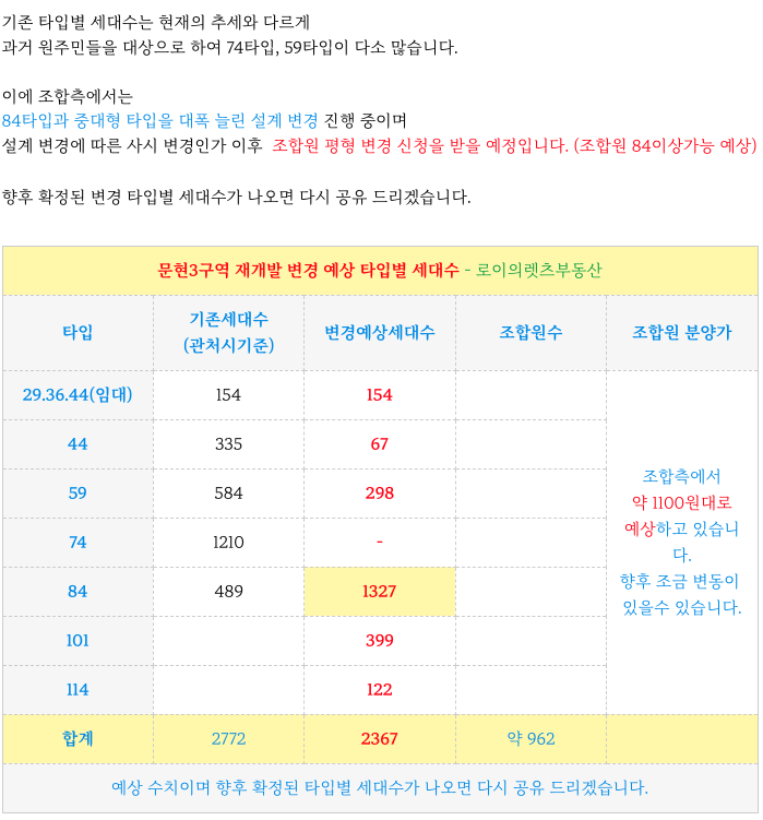 문현3구역 재개발의 현 타입별 세대수와 변경 예상 타입별 세대수 입니다.