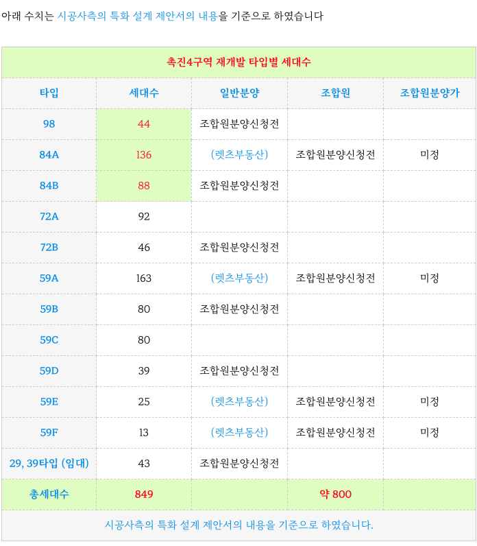 시민공원 촉진4구역 재개발의 각 타입별 세대수 입니다.