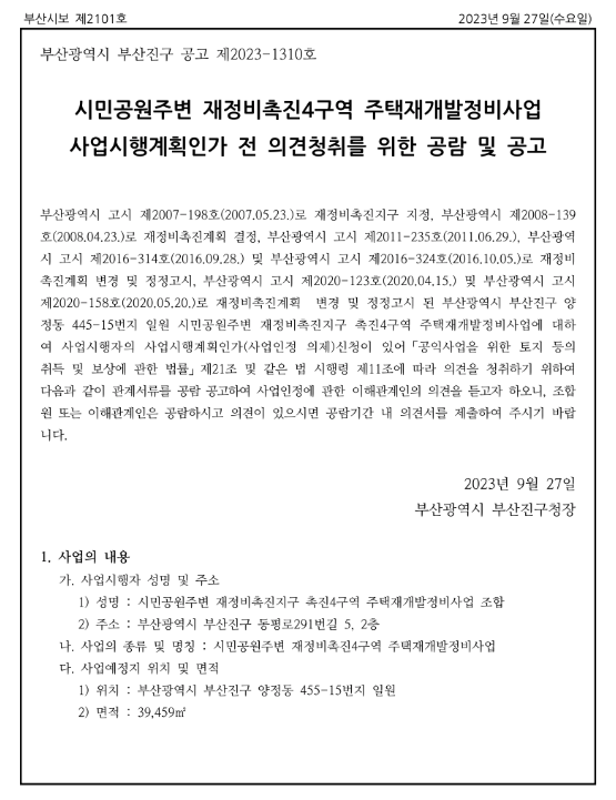 시민공원 촉진4구역 재개발은 사업시행계획인가를 위한 공람공고를 시작하였습니다.