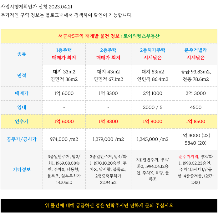 서금사5구역 재개발의 소액 최저 매물 역시 소개 드리겠습니다.