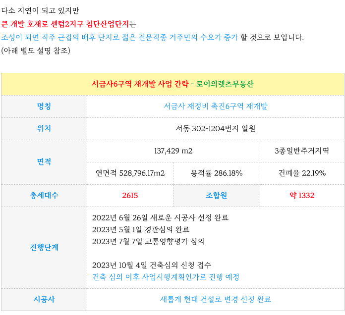 서금사6구역 재개발의 특징을 간략히 정리하였습니다.