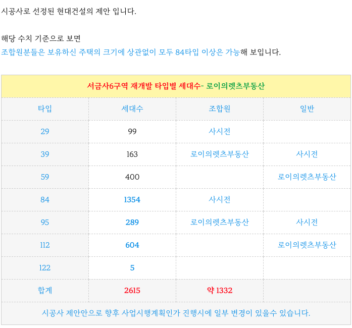 서금사6구역 재개발 타입별 세대수 입니다.