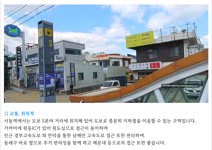 서동의 평지에 위치하며 서동역과 도보로 5~10여분 정도로 준 역세권에 위치하고