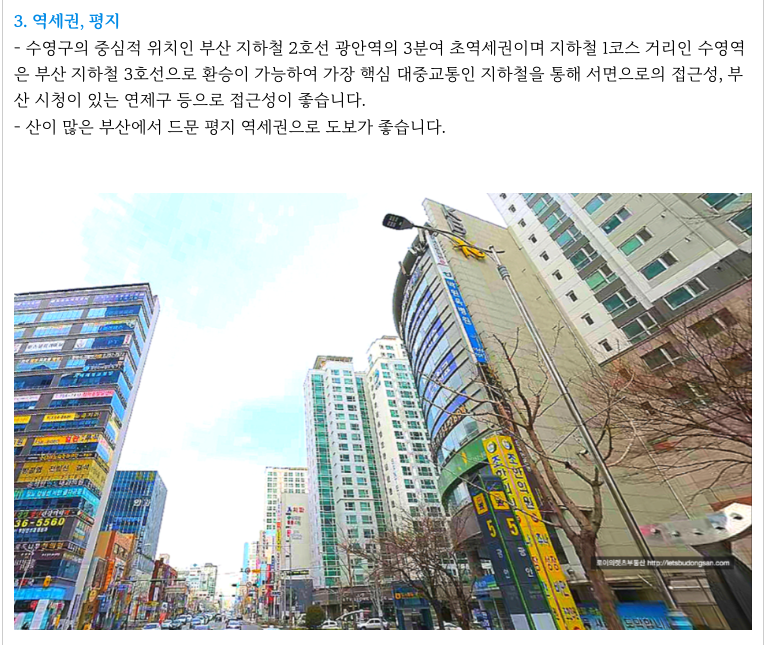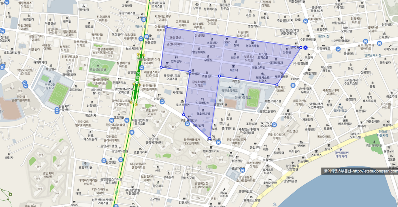 - 수영구 중심 광안동, 광안리 해수욕장, 주변시세 높은